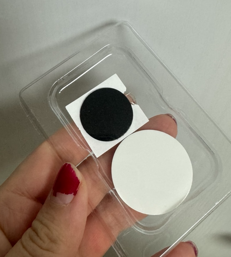 검은색 동그라미 스티커를 휴대폰 케이스 뒷면에 붙이면 되는데요.
